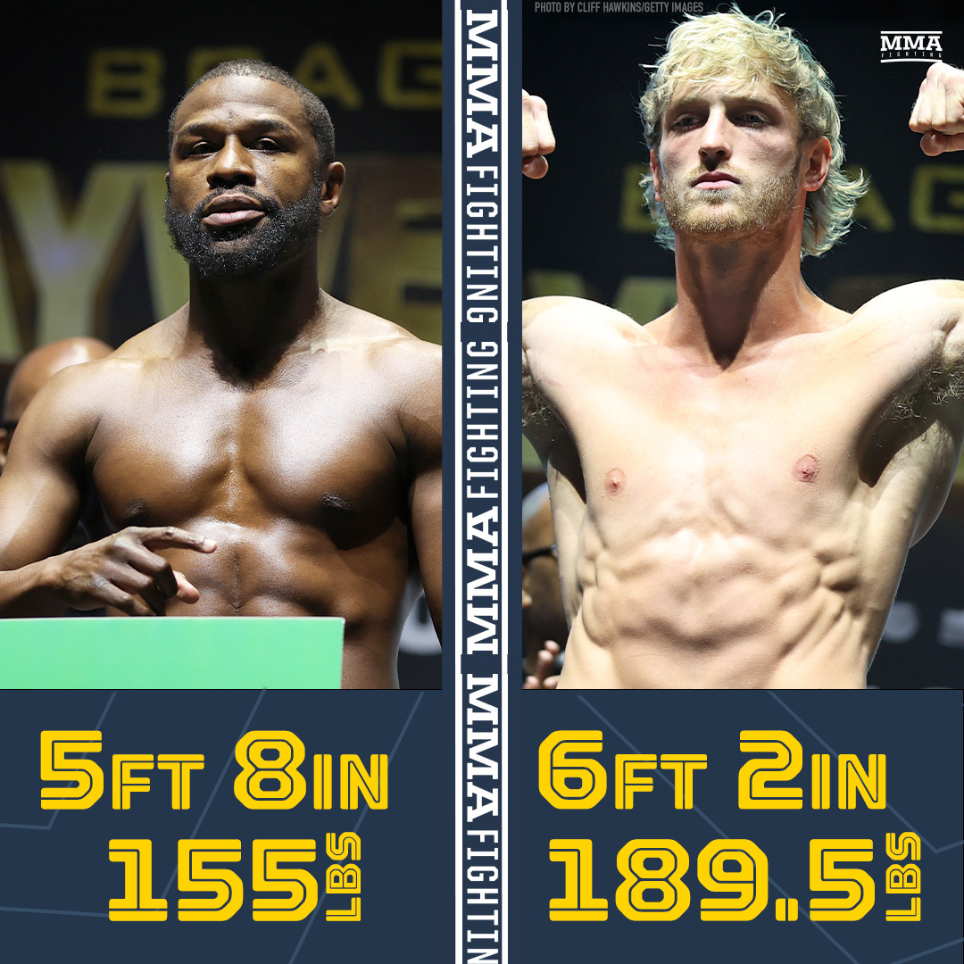 Mayweather Vs Paul Weigh In Results Logan Paul Outweighs Floyd Mayweather By Over 34 Pounds Mma Fighting